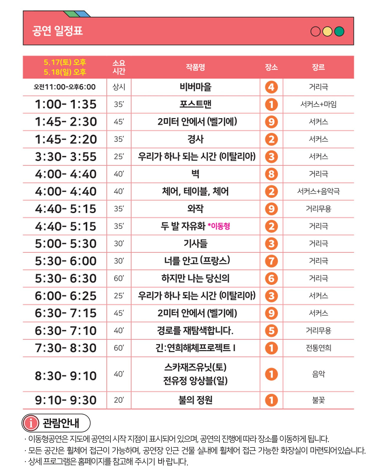 이번 축제에서 내가 3살 아기와 챙겨볼 예정인 공연은 다음 세 가지다. 불의 정원이 메인 공연이라 꼭 보고 싶은데, 시작시간이 밤 9시라 아기의 취침시간을 좀 희생하더라도 공연을 보고 갈까 싶다. 모기퇴치 스티커는 필수로 가져가야겠지. 벽과 비버마을은 불의 정원을 기다리며 적당히 둘러보기에 좋을 것 같다. 전체 공연 일정과 행사 위치는 따로 이미지로 첨부한다.