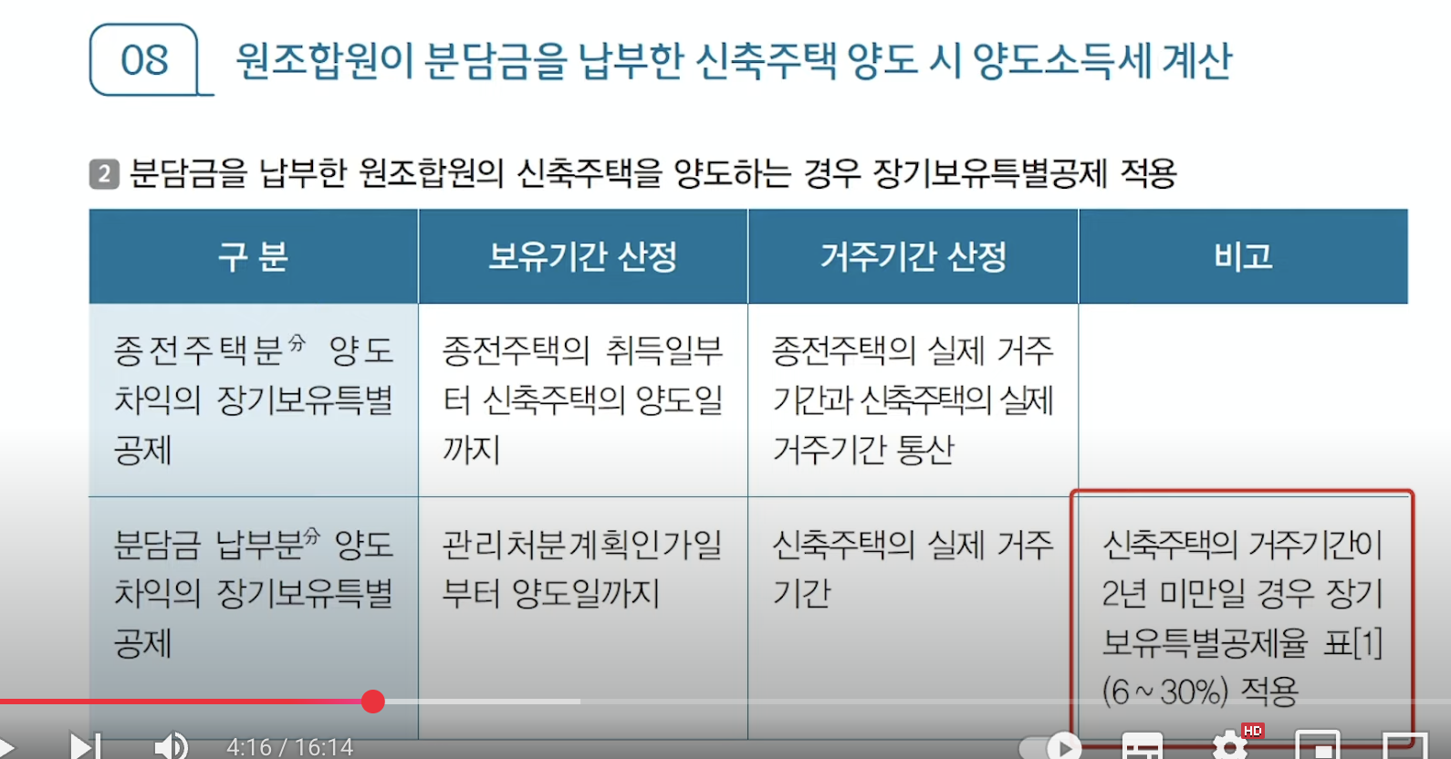 분담금 납부분만큼은 신축주택에서 2년 미만으로 거주했을 경우 그 부분에 한해서는 장기보유특별공제 혜택에 해당하는 요율을 적용할 수 없다고 한다. 한 마디로 신축된 주택에도 2년 이상 거주하는게 유리하다.