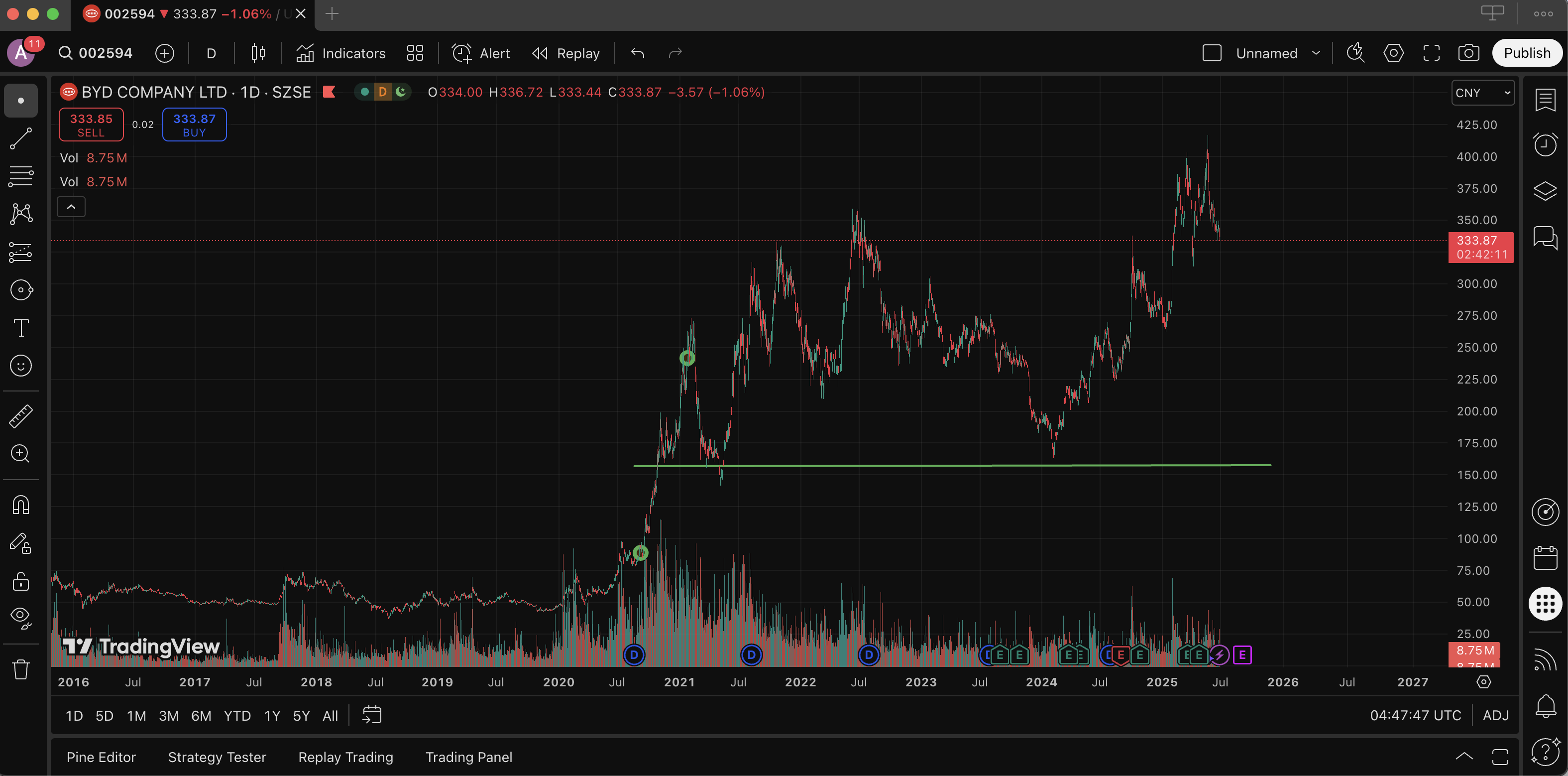BYD 주식을 상승장 초입에 절반, 그 뒤 첫 고점에서 또 절반. 이렇게 두 번을 구매했다. 중국 주식은 100주 단위로 구입할 수 있어서 분할매수가 용이치 않아 비교적 신중하게 매수해야 하는데, 그 당시 나는 알리바바에 비중을 훨씬 더 많이 실어서 매수했던게 계속 아쉽다.